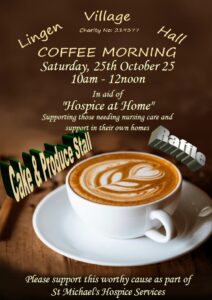 Lingen Village Hall is excited to host a Coffee Morning in aid of “Hospice at Home” on Saturday, 25th October 10am – 12 noon.